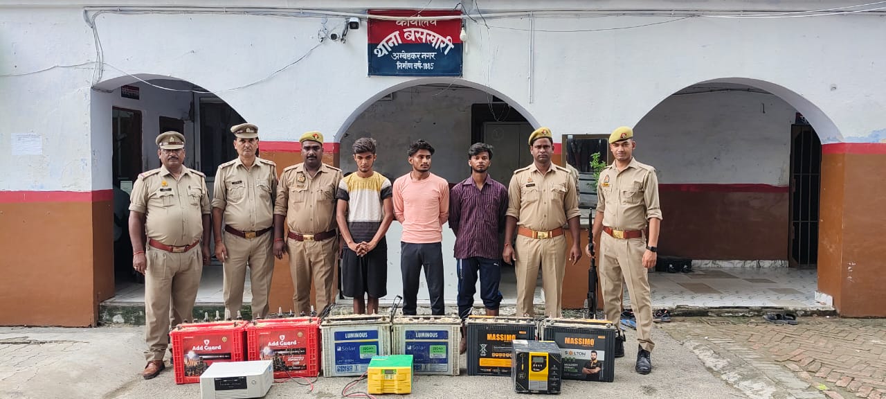 अम्बेडकरनगर ! 09 अगस्त 2025 — थाना बसखारी पुलिस ने चोरी की घटनाओं में वांछित तीन आरोपियों को गिरफ्तार कर 6 चोरी की बैटरी और 3 इनवर्टर बरामद किए हैं। गिरफ्तारी बुढ़नापुर तिराहे से मुखबिर की सूचना पर सुबह करीब 1:30 बजे हुई।