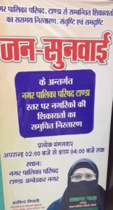 कार्यक्रम का विवरण – स्थान: नगर पालिका परिषद, टांडा समय: अपराह्नन 02 बजें से – 04 बजें तक दिन मंगलवार जनसुनवाई के मुख्य अतिथि: शबाना नाज़, अध्यक्ष, नगर पालिका परिषद टांडा
