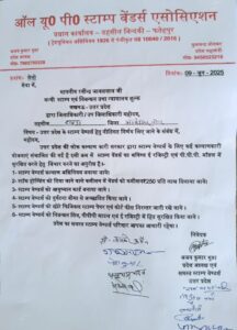 स्टाम्प वेंडर्स के लिए नीतिगत निर्णय की मांग” स्टाम्प वेंडर्स कल्याण अधिनियम बनाने की मांग” स्टाम्प वेंडर्स के लिए आयुष्मान कार्ड और दुर्घटना बीमा की मांग” “स्टाम्प वेंडर्स के हितों को सुरक्षित करने की मांग”