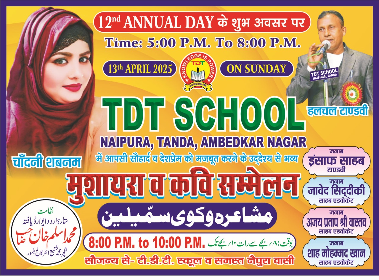 स्थान: टीडीटी पब्लिक स्कूल, नेपुरा, टांडा, जनपद अम्बेडकरनगर, हमें उम्मीद है कि आप इस भव्य आयोजन में अपनी उपस्थिति दर्ज कराएंगे और मुशायरा और कवि सम्मेलन का आनंद लेंगे।