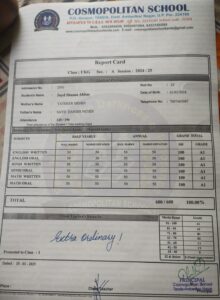 कोस्मोपोलिटन स्कूल में छात्र छात्राओं को परिक्षाफल वितरित” सैय्यद शाज़ान अब्बास के प्रथम स्थान प्राप्त करने पर स्कूल के चेयरमैन ने प्रोत्साहित किया!