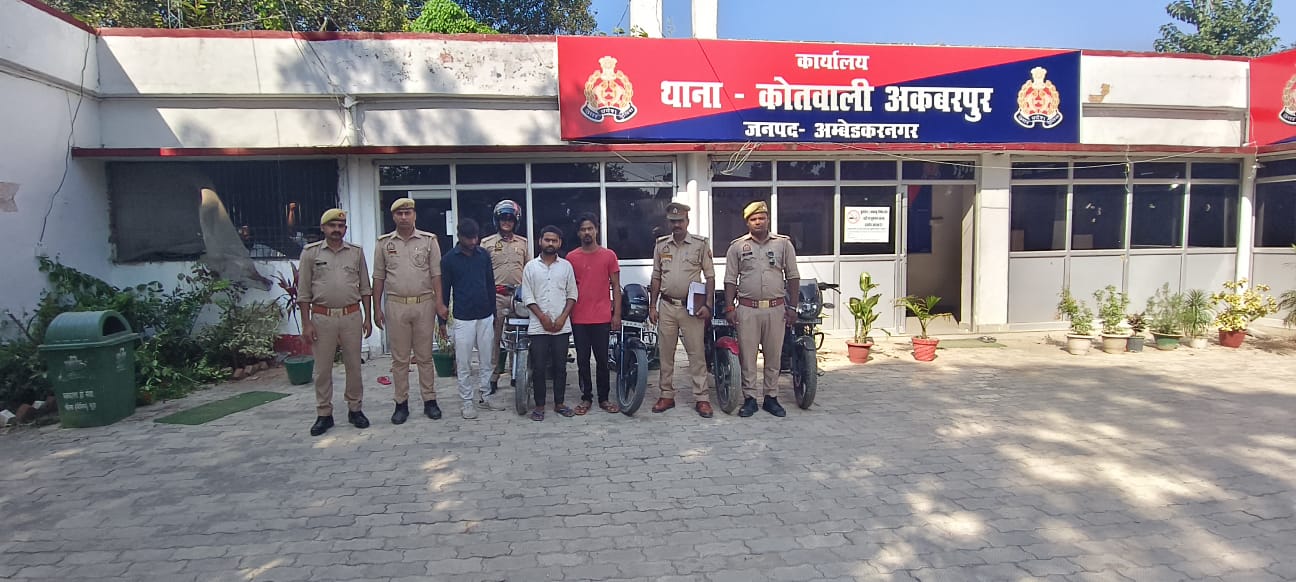 थाना कोतवाली अकबरपुर पुलिस टीम ने तीन शातिर बाइक चोरों को गिरफ्तार करते हुए चार चोरी की मोटरसाइकिलें बरामद की हैं। सभी अभियुक्तों का आपराधिक इतिहास बेहद लंबा और गंभीर अपराधों से भरा हुआ है।